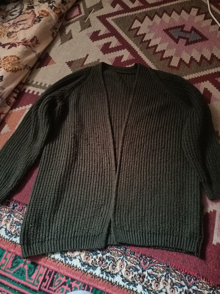 Koyu kahverengi örgü, bol kesim, uzun kollu ve yuvarlak yaka bohem tarzı kadın hırka, günlük kullanım için uygundur.