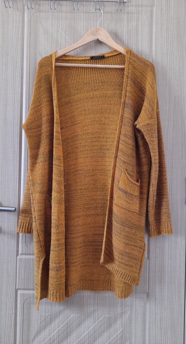 Bohem tarzı, kahverengi örgü kadın hırka, bol kesim ve uzun kolludur. Midi boyda, yuvarlak yaka ve sade, rahat kullanıma uygundur.