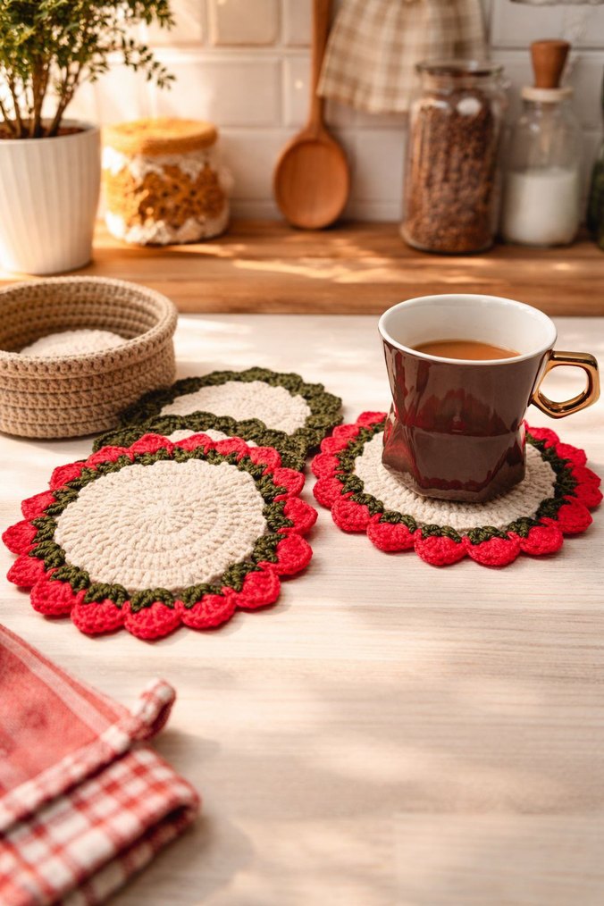 Bohem tarzı, kırmızı ve yeşil kenarları olan yuvarlak örgü kahve altlıkları, el yapımı şıklık katıyor ☕. 4 lü ve saklısı, saksı içerisinde çiçek desenli saklanır.