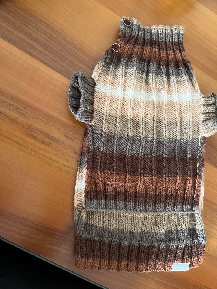 Bohem tarzı, kahverengi ve gri tonlarında örgü köpek süveteri. Yaka kısmında düğmeli ve fitilli dokusu vardır.