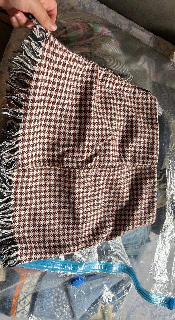 Bohem tarzı, kahverengi kazayağı desenli örgü midi etek, püskül detaylı ve rahat bol kesimdir.