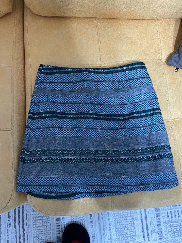 Bu bohem tarzı, mavi ve gri tonlarda örgü dokulu, fitted mini etektir. Kısa boyu ve rahat kumaşı günlük kullanım için uygundur.