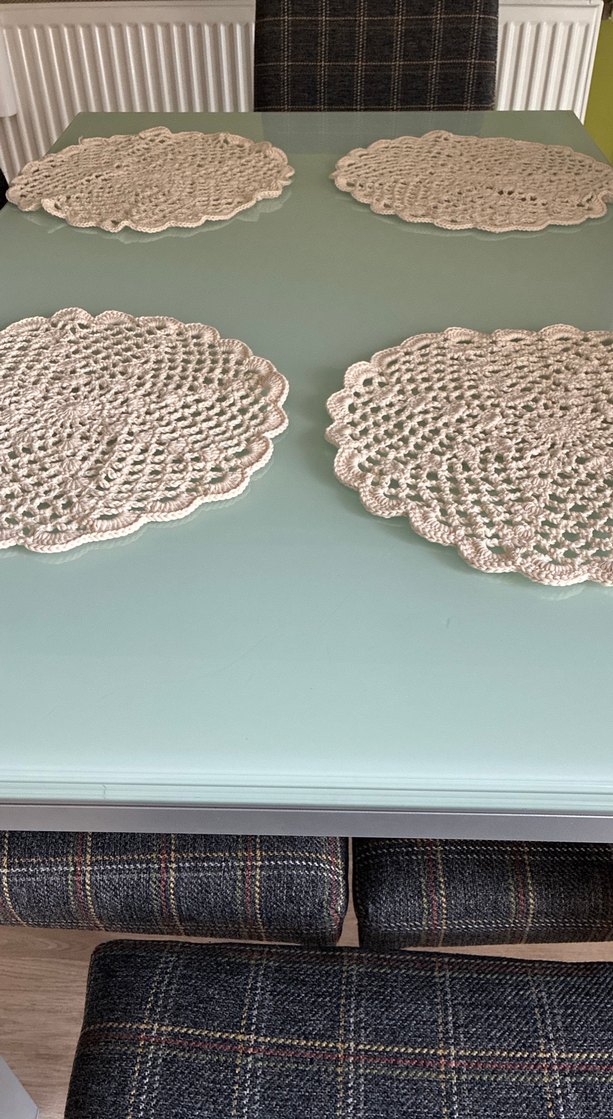 Yumuşak iplikle örülmüş, bohem tarzda dört adet yuvarlak tabak altlığı seti. Masanıza el işi dokunuşu katar.