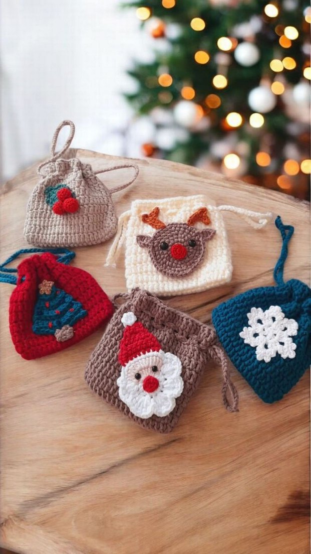 Bohem tarzda el yapımı örgü çantalar, Noel temalı tasarımlar içerir.