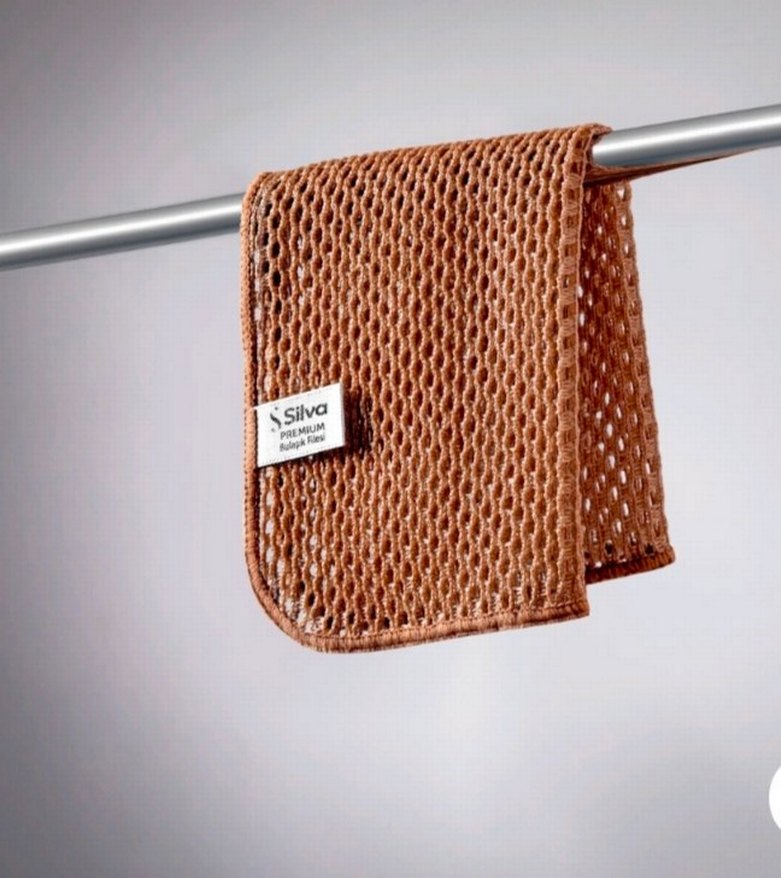 Parlak kahverengi renkte, bohem yılan deseniyle bulaşık filesi, antibakteriyel. Üzerinde "Silva" etiketi bulunur, şık bir görünüm sunar.
