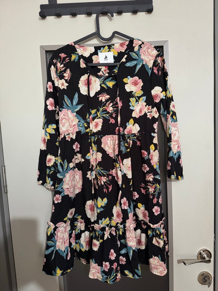Bol kesim, uzun kollu, V yaka ve fırfırlı elbise tunik. Koyu zemin üzerinde canlı pembe çiçek desenli, yumuşak sentetik kumaştan günlük kullanım için uygun.