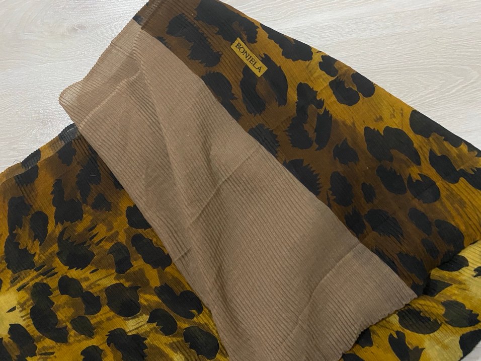 Kadın fular, yumuşak sentetik kumaştan yapılmış, kahverengi ve leopar desenli pileli tasarıma sahiptir. Bohem ve retro tarzlara uygundur.