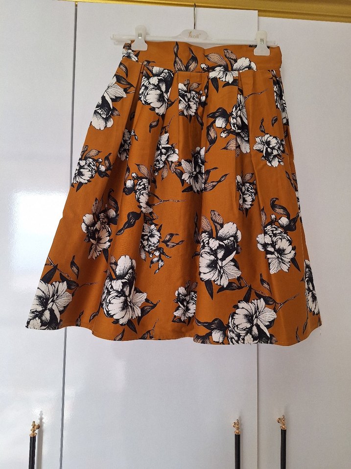 Bohem tarzında, piliseli ve vintage çiçek desenli koyu kahverengi sarımtrak midi etek. Rahat kalıp ve sentetik kumaştan, günlük kullanıma uygun.
