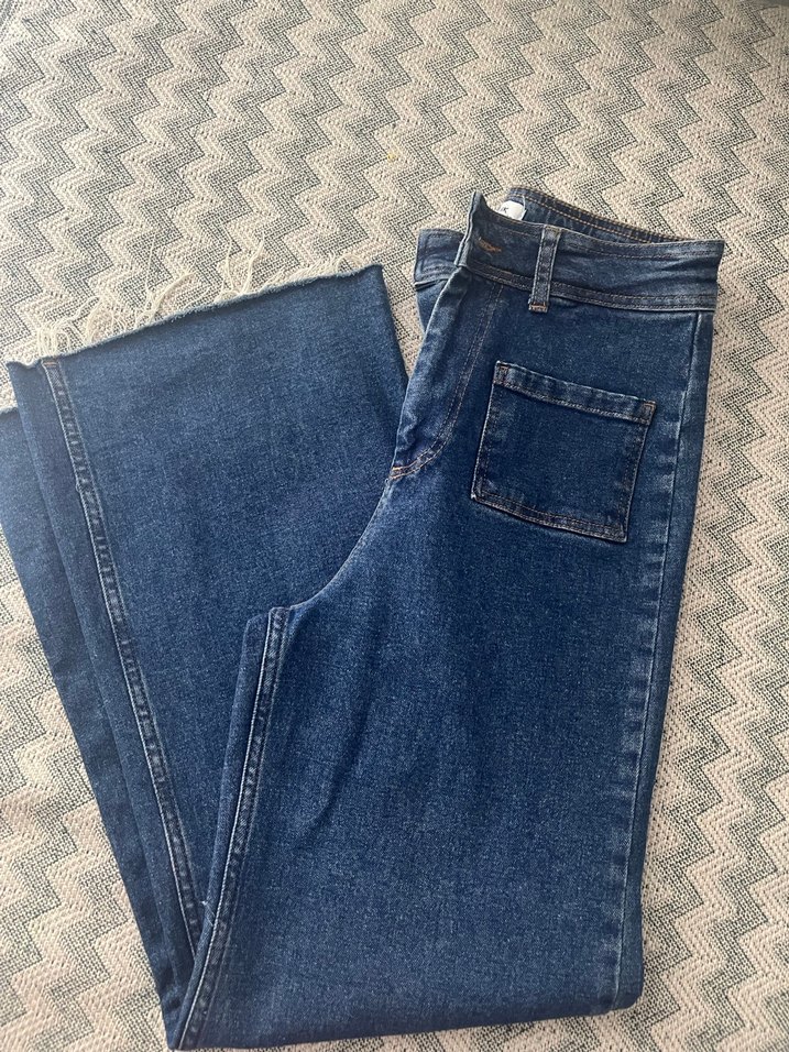 Bohem tarzı, regular fit, midi uzunlukta lacivert denim kadın jean, günlük kullanıma uygun rahat ve şık görünümlü.