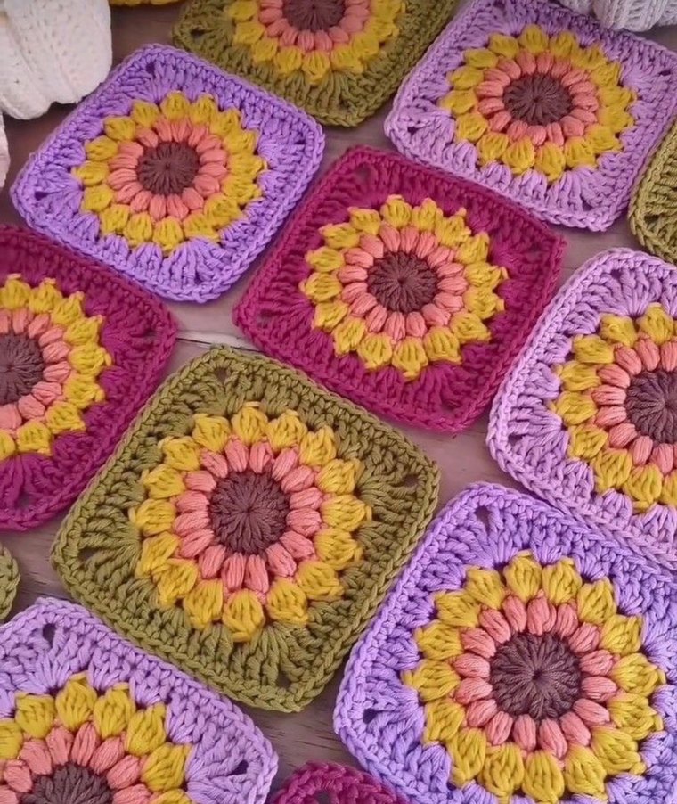 Bohem tarzda, sıcak tonlarda çiçek desenli renkli el örgüsü kare motifler. El işi ve dekorasyon için uygundur.