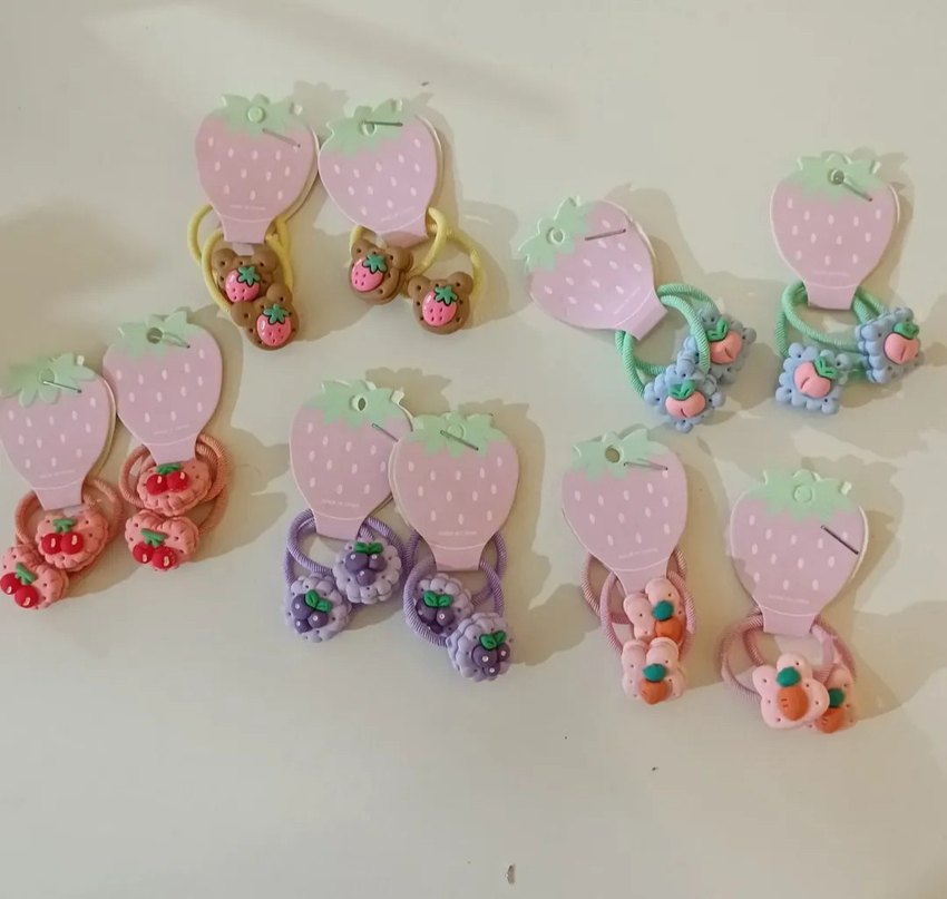 Pastel renklerde elastik, meyve işlemeli çocuk saç tokaları, bohem ve retro tarzı için uygundur.