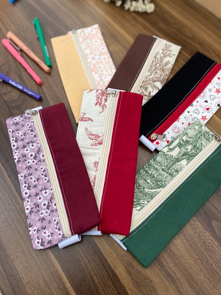 Bohem tarzı, renkli kumaş paneller ve fermuarlarla tasarlanmış kalemlikler. Her biri farklı desen ve dokulara sahip. ✏️ lastikli yapısıyla defterinize ve kitabınıza takıp kullanım kolaylığı sağlayabilirsiniz ✨