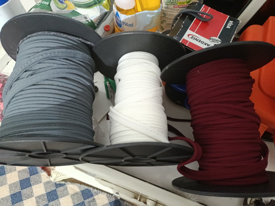 Bohem tarzı, çeşitli renklerde yumuşak ip ruloları. Beyaz ip öne çıkıyor, diğer renkler de görülüyor.