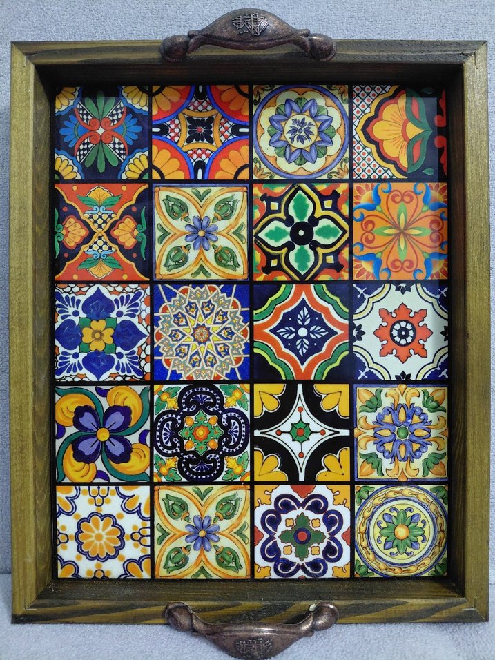Ahşap çerçevede, detaylı desenlere sahip renkli seramik karolardan oluşan bohem tarzı tepsi. Sunum veya dekorasyon için uygundur.
