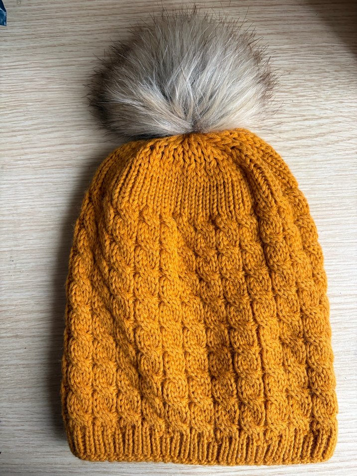 Bohem tarzda, sarı örgü kadın bere, üzerinde gri suni kürk ponpon ile rahat ve şık görünüyor.