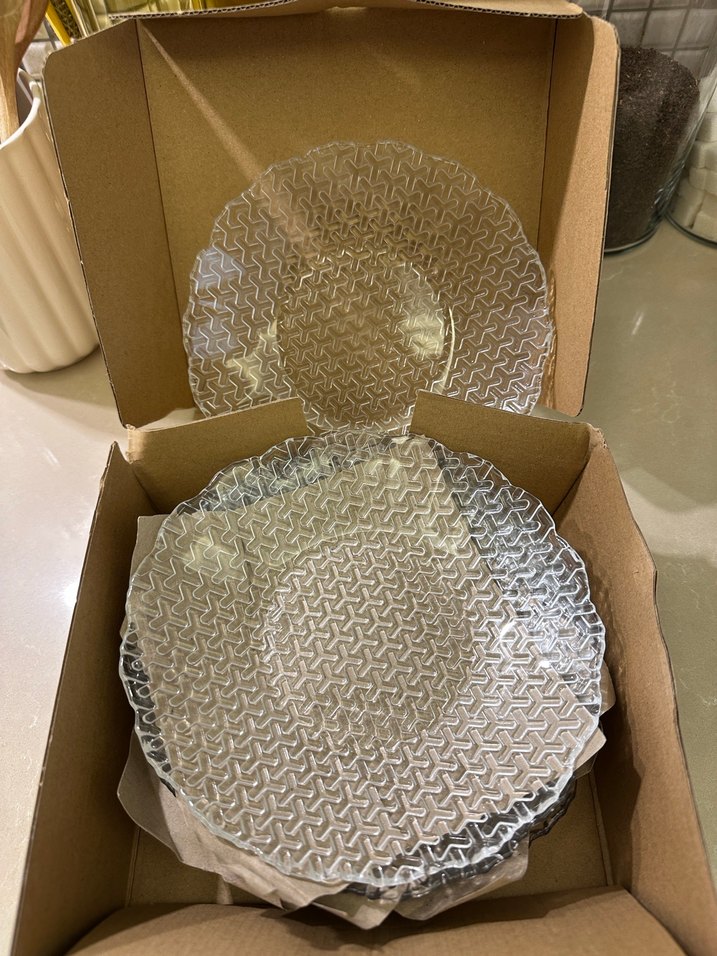 Bohem tarzı, bej ve gri tonlarda, şeffaf geometrik desenli cam tabak seti. ️