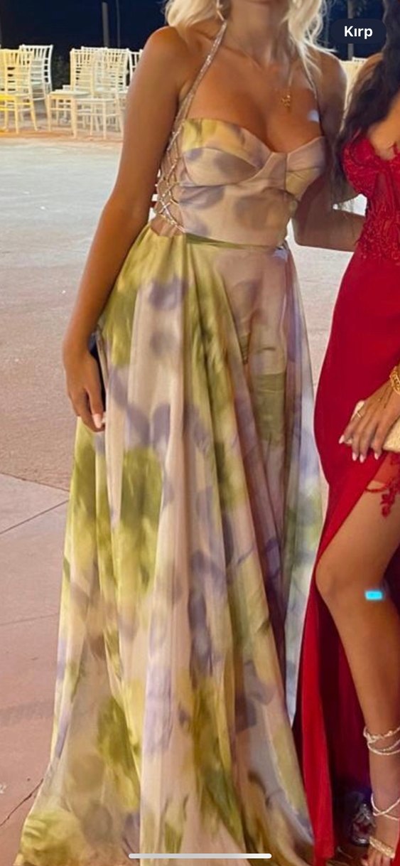 Bohem tarzı, straplez, uzun, bağlamalı elbise. Çok renkli batik desenli, sentetik kumaştan, düğün için uygun hafif şık görünüm.