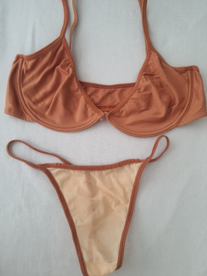 Minimalist, bohem tarzı sütyen ve tanga seti, normal uzunlukta ve desensiz tasarıma sahiptir. etiket L ancak 36-38 bedenlere uygun.Sütyen bluz gibi yukarıdan giyiliyor +2 adet G string
