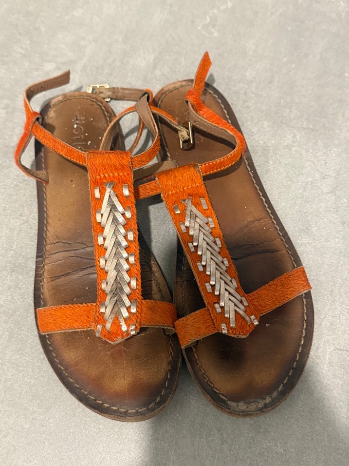 Kahverengi deri, toka detaylı, parlak yılan deseni ve bohem tarzı kadın sandalet. Günlük kullanım için uygundur.