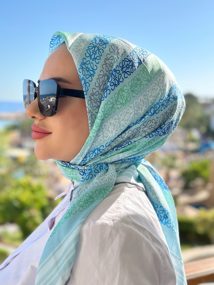 Hafif turkuaz renkli, drapeli stil ve yumuşak sentetik kumaştan yapılmış kadın şalıdır. Mütevazı, bohem ve sokak stiline uygundur.