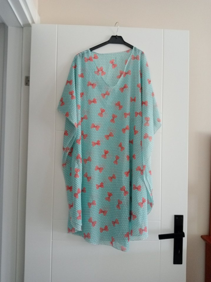 Bohem tarzı, bol kesim, pastel turkuaz renkli, baskılı pareo. Kısa kollu, V yaka, günlük kullanım için uygundur.
