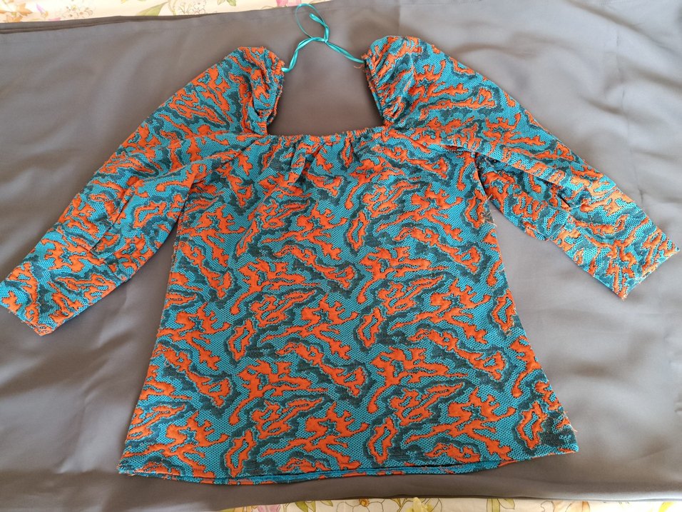 Bohem tarzı, turkuaz yılan desenli, parlak sentetik kumaştan, uzun kollu ve pilili hamile bluzu. Midi boy, rahat kesim ve tekne yaka detaylıdır.