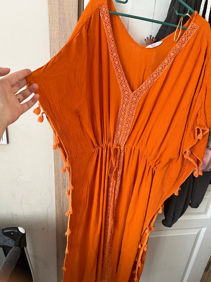 Turuncu renkli, bol kesim ve drapeli V yaka, kısa kollu ve nakışlı detaylara sahip bohem tarzda bir parça. Şile bezi penti marka sorunsuz