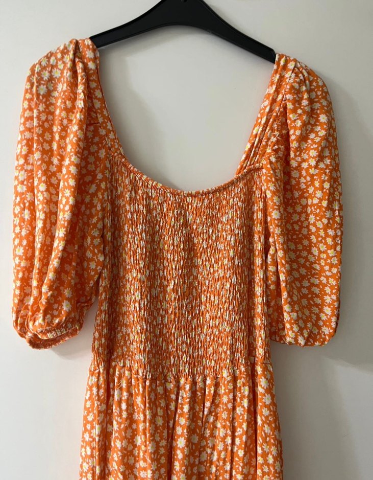 Açık turuncu bohem uzun elbise, kayık yaka ve kısa balon kollu. Bol kesim, fırfırlı ve çiçek desenli.