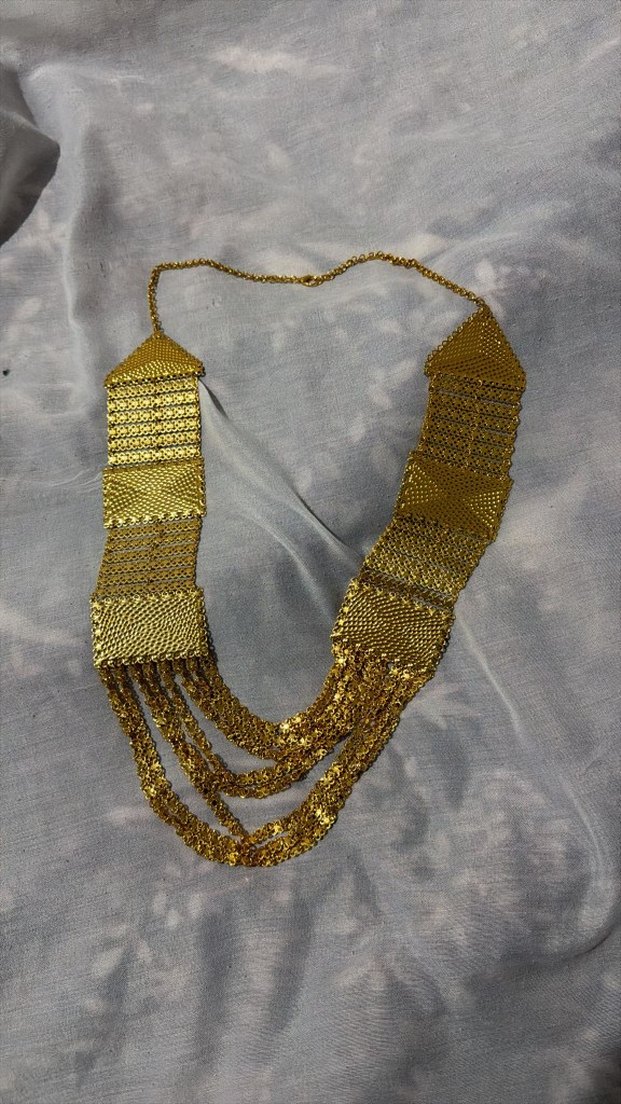 Uzun boylu, zincir detaylı ve parlak yılan desenli altın renkli kolye, bohem tarzı için uygun. ✨