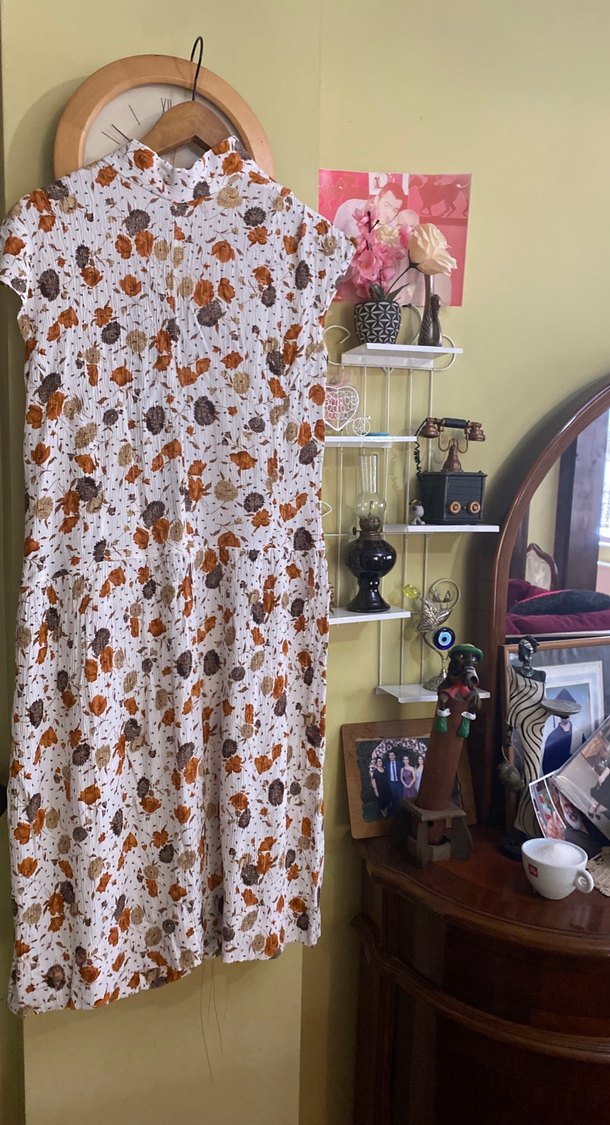 Yumuşak pamuklu kumaştan, bohem tarzı, yüksek yakalı, kısa kollu, düğmeli, açık kahverengi bağlama desenli bol kesim elbisesi.