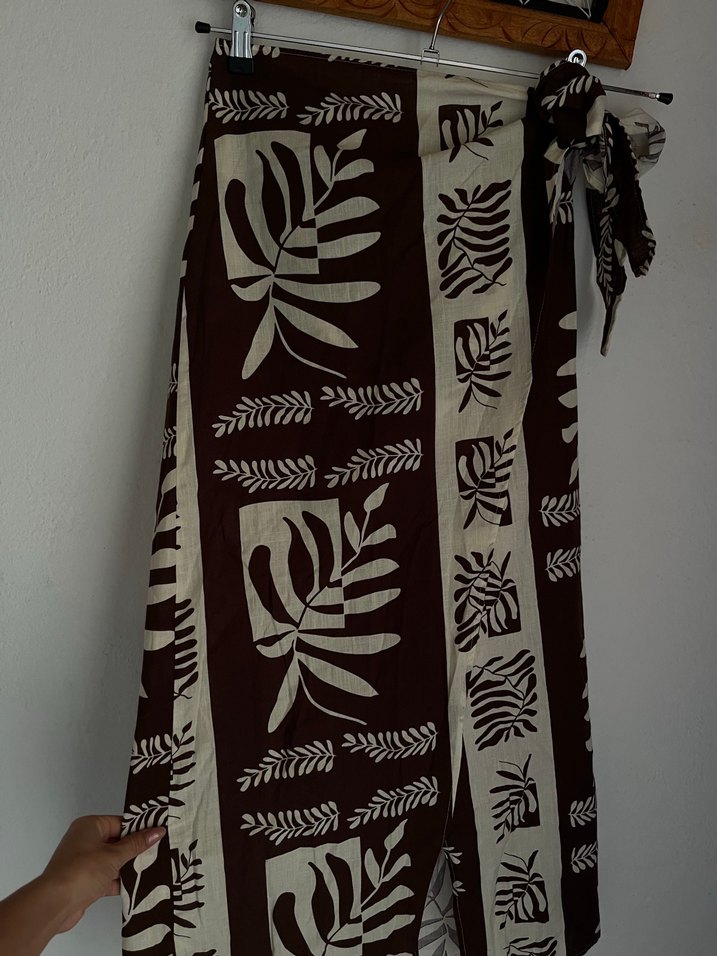 Bohem tarzda, bağlamalı ve bol kesim uzun etek. Koyu kahverengi batik desenli, yumuşak dokulu kumaştan üretilmiştir. Uzun geldiği için kendime yakıştıramadım