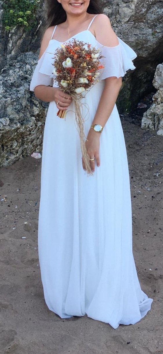 Uzun, beyaz A kesim gelinlik, bohem tarz için uygun, bol kesim ve askısız yakalıdır. İnce askılı kollara ve hafif, akıcı kumaşa sahiptir. Nikah ve nişan elbisesi olarakta kullanılabilir Sadece bir kez giyildi herhangi bir defosu yoktur