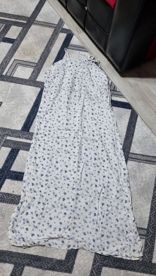 Kolsuz, bol kesim uzun beyaz elbise, zarif çiçek desenli, rahat ve bohem tarzda bir görünüm sunar.
