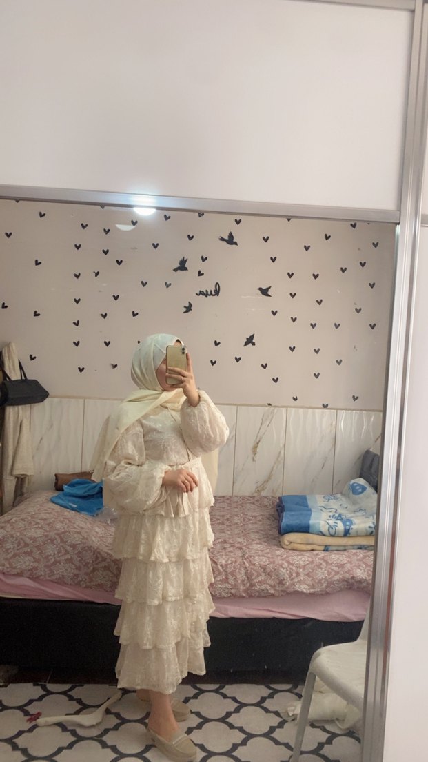 Yüksek yakalı, uzun kollu, pamuklu ve bol kesim olan bu uzun beyaz elbise, drapeli katmanlarla bohem tarzı ve sade şıklık sunar.