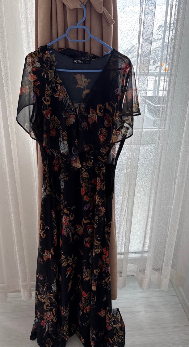 Sentetik kumaştan üretilmiş, uzun ve dar kesimli, koyu renkli çok desenli, V yakalı ve drapeli, bohem tarzda kolsuz elbise.