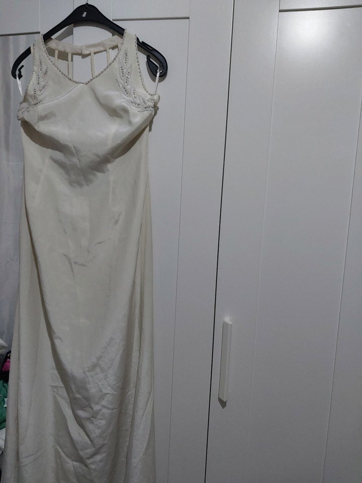Askısız ve kolsuz, vücuda oturan bu uzun gelinlik, vintage bohem tarzını yansıtan ince detaylara sahip, yumuşak kırık beyaz tonlarında.