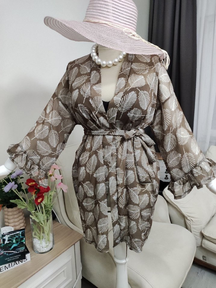 Bohem tarzda, uzun ve kahverengi çiçek desenli, askılı kollu bol kesim kadın pareo. Rahat bir görünüm için ideal.