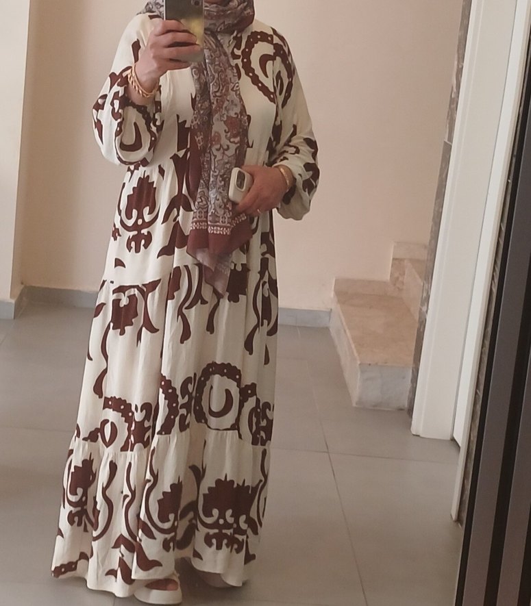 Yumuşak dokulu tekstil kumaştan, bol kesim, yüksek yakalı ve uzun kollu, kahverengi bohem desenli drapeli uzun elbise. bi kaç saat giyildi tertemiz sorunsuzdur