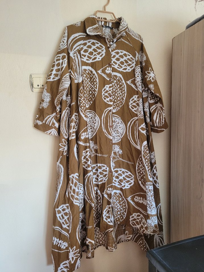 Kahverengi bohem tarzı uzun elbise, salaş kesim, kısa kollu ve yüksek yakalıdır. Beyaz desenli, dökümlü yapıya sahiptir, günlük kullanıma uygundur.