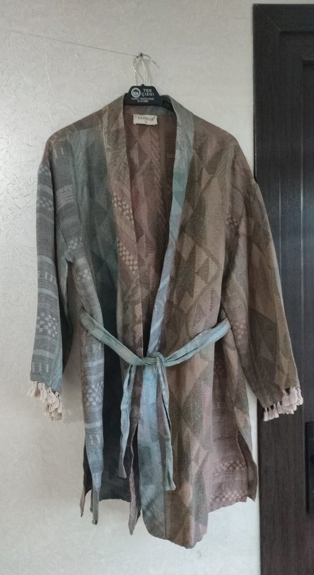 Bohem tarzı, uzun kollu, kemerli ve kesik yakalı, gri batik desenli bej tekstil kimono. Rahat ve salaş kesim.Tarzima uymayinca kullanamadim