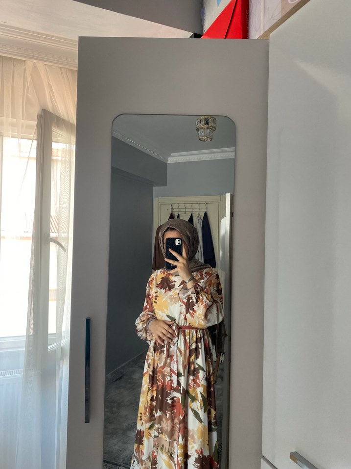 Yüksek yakalı, uzun kollu, bağlamalı ve bol kesim bohem tarzı uzun elbise. Sentetik kumaş ve camel tonlarında batik desenli, günlük kullanıma uygun.