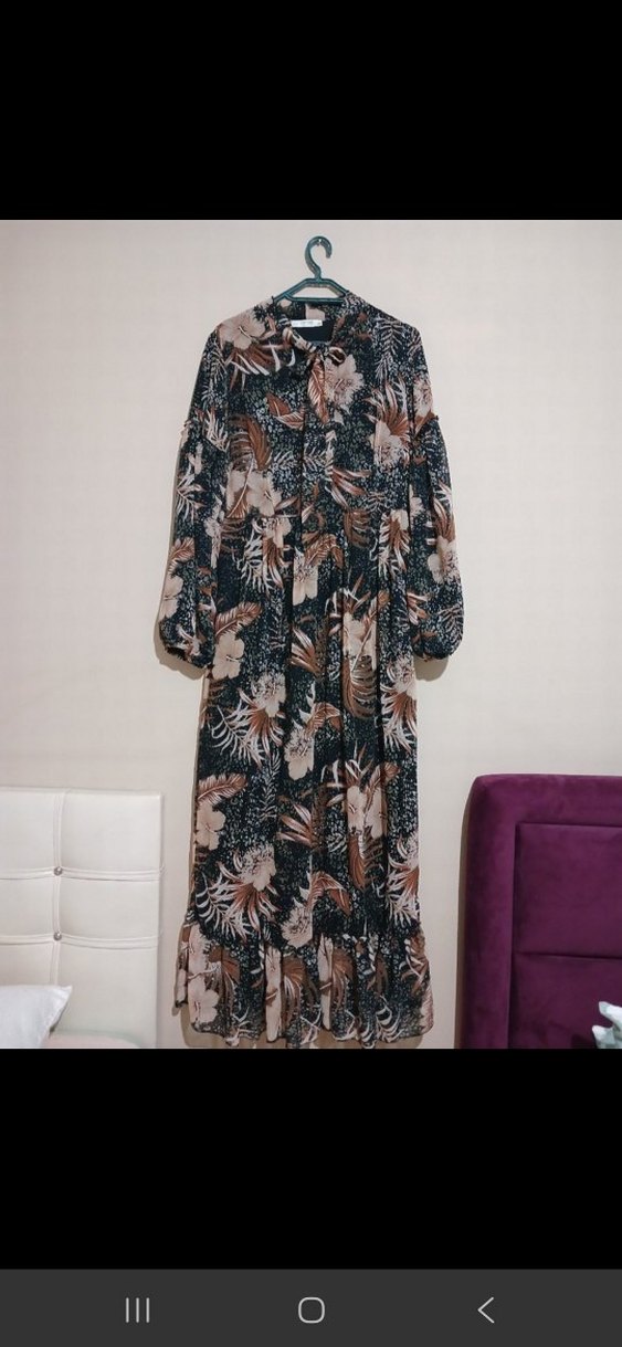 Uzun kol, yüksek yakalı, bol kesim ve pliseli detaylara sahip. Koyu kahverengi tie-dye desenli, bohem tarzda ve sentetik kumaştan yapılmış.