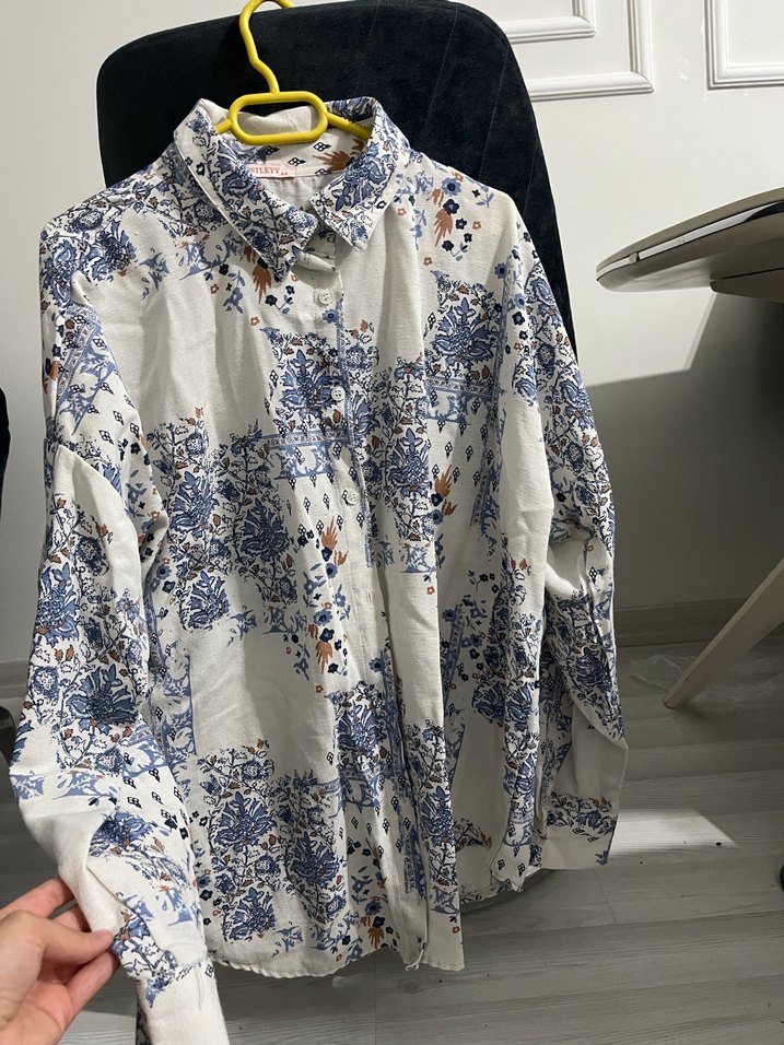 Bol kesim, yakalı ve düğmeli uzun kollu kadın gömleği. Beyaz ve gri tonlarda bohem desenli, günlük kullanıma uygun.tiftiklenme var ama belli belirsiz