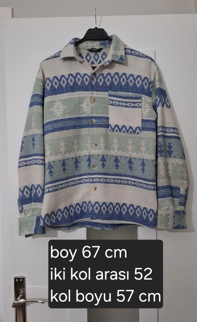Yumuşak kumaştan, düğmeli ve yakalı, bol kesim uzun kollu gömlek. Çok renkli, rahat tie-dye desenli. Ölçüler: boy 67 cm, göğüs 52 cm.