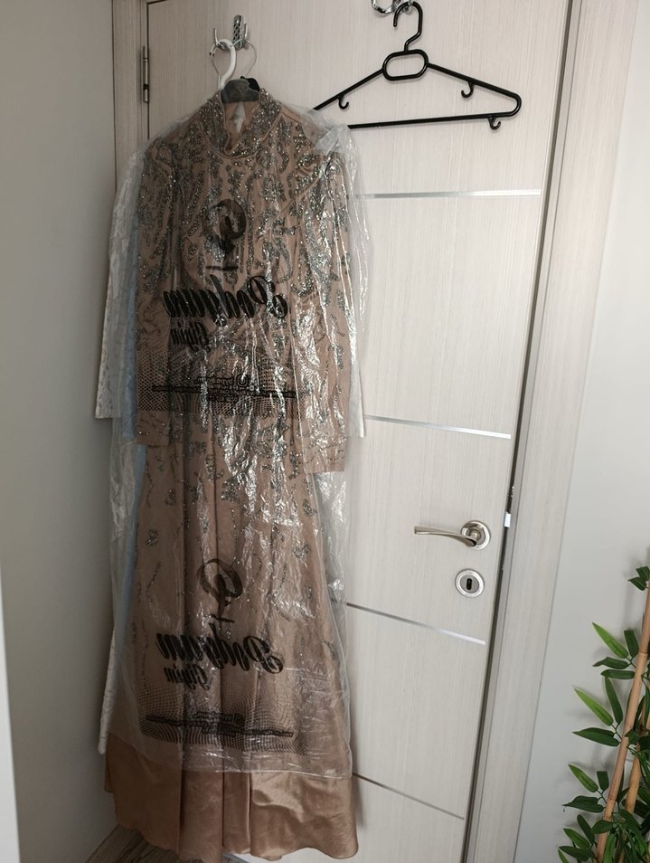 Bej renkli, uzun kollu ve yakalı, drapeli ve baskılı detaylara sahip, vintage ve bohem tarzı karışımı uzun elbise. Fit kesim, düğün için uygun.