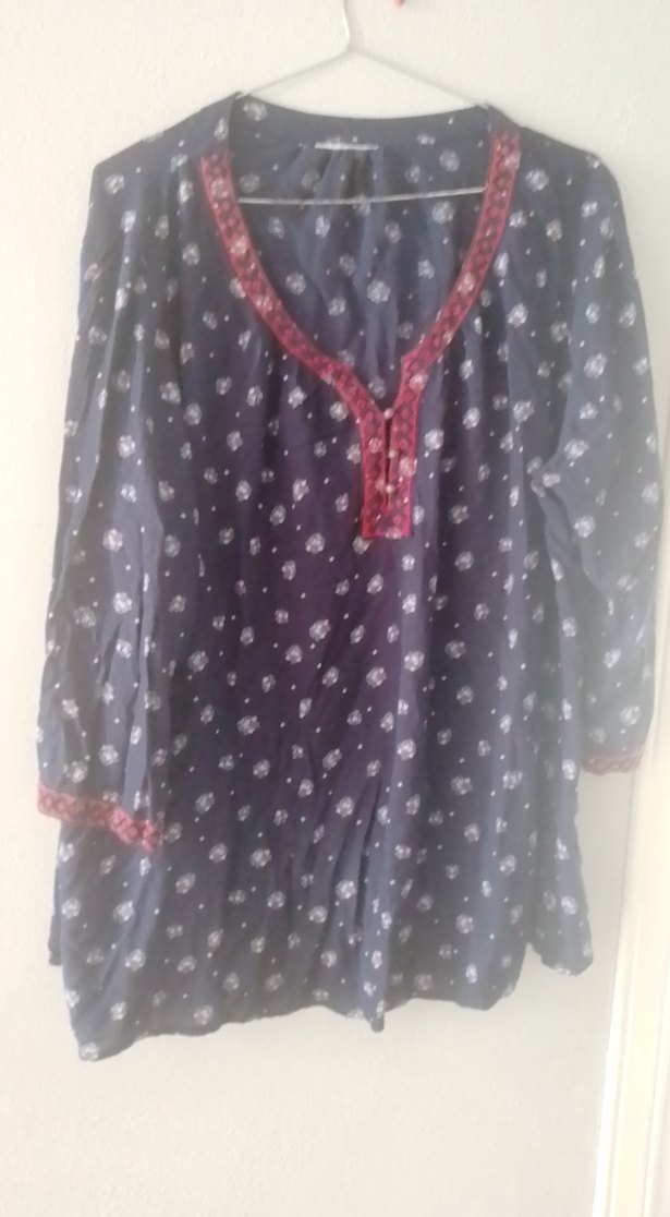 Uzun kollu, V yaka, düğmeli ve hafif çiçek desenli lacivert, bol kesim tunik. Rahat ve günlük kullanım için uygundur.