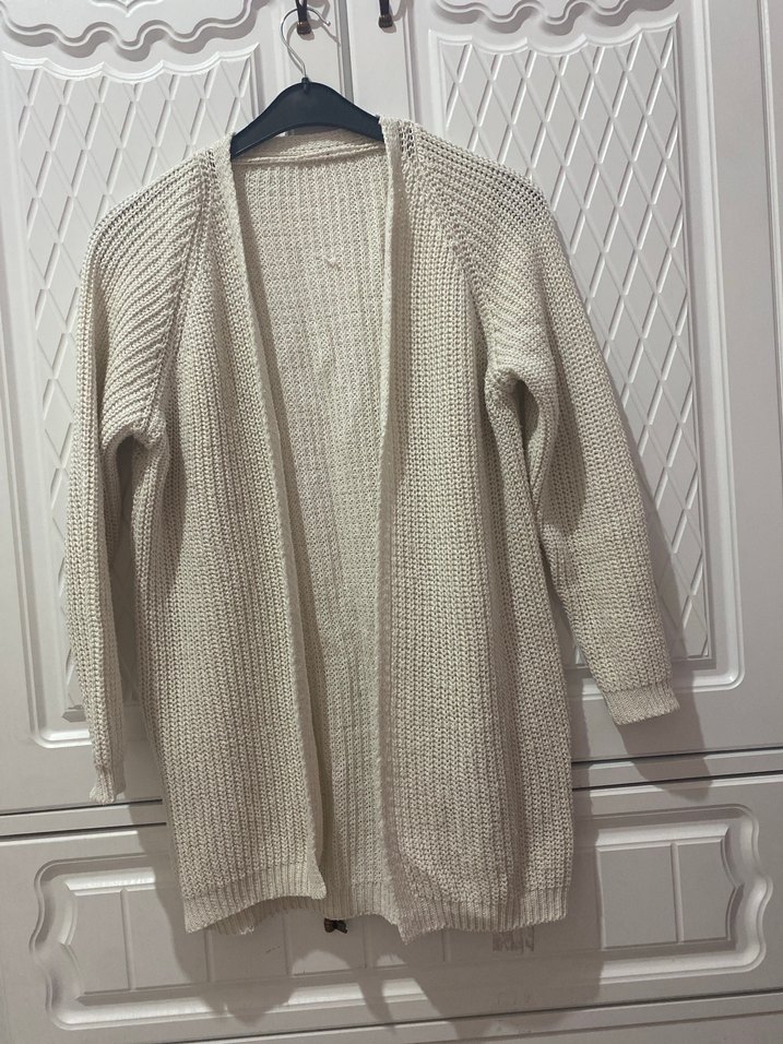 Beyaz renkli, notlu yakalı ve bol kesim örgü hırka. Uzun kollu ve midi boyda, günlük kullanıma uygun sade ve rahat bir model.