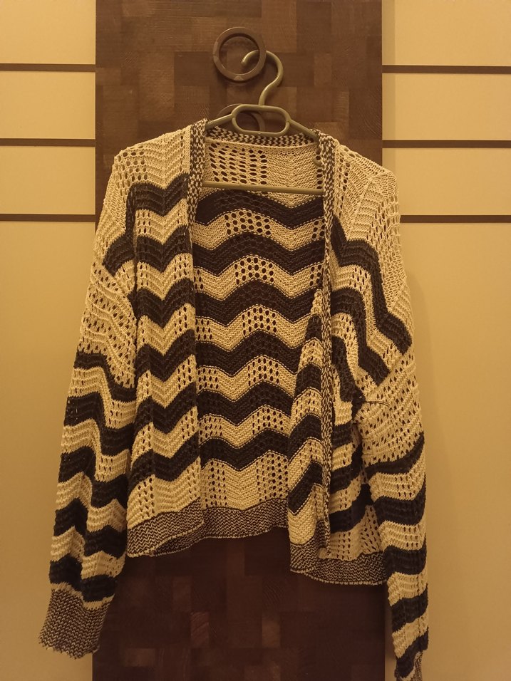 Bohem tarzı, uzun kollu, örgü kadın hırka. Midi boyda, bol kesim ve tekne yaka. Kahverengi ve gri zebra desenlidir, rahat ve şık.