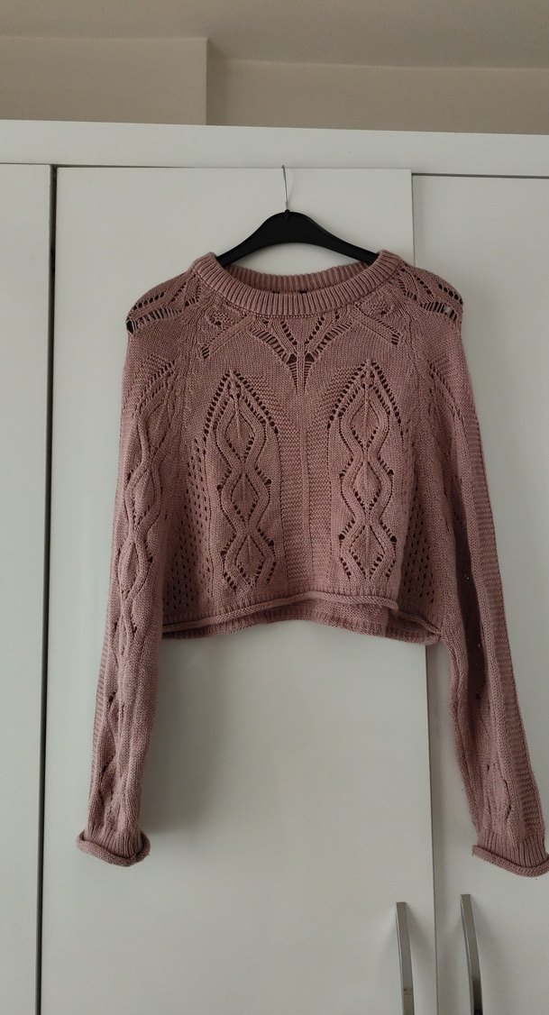 Toz pembe renkli, uzun kollu, yuvarlak yaka, bol kesim yarasa kol kadın kazak. Örgü yapısı ve bohem tarzıyla günlük kullanıma uygundur.