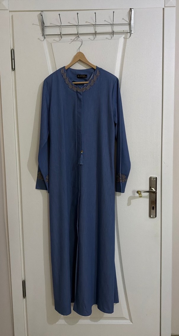Uzun, bol kesim kot elbise, uzun kollu, yakası kesik ve nakışlı detaylıdır. Saçaklı süslemeleriyle koyu mavi renkte, sade ve bohem tarzda günlük kullanıma uygundur.